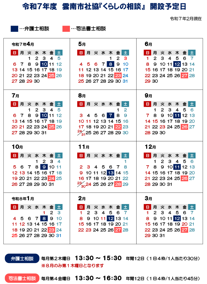 | 弁護士 | 毎月第2木曜日 | 13:30~15:30 |